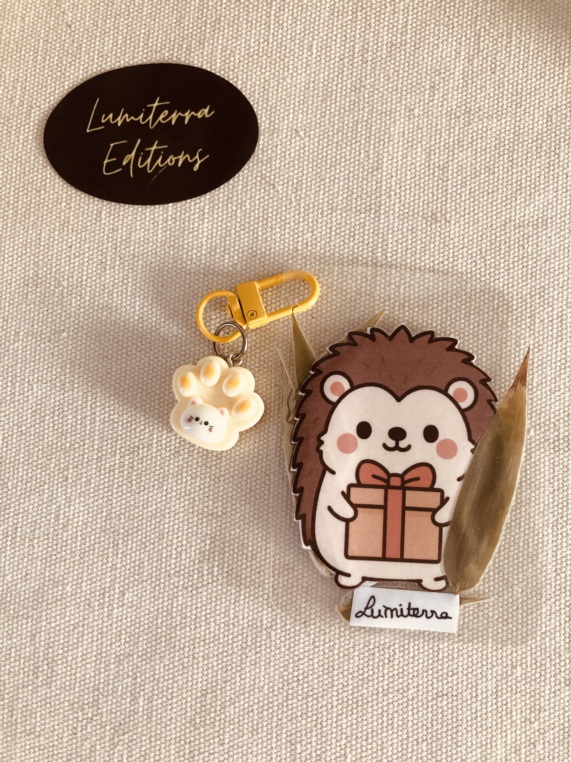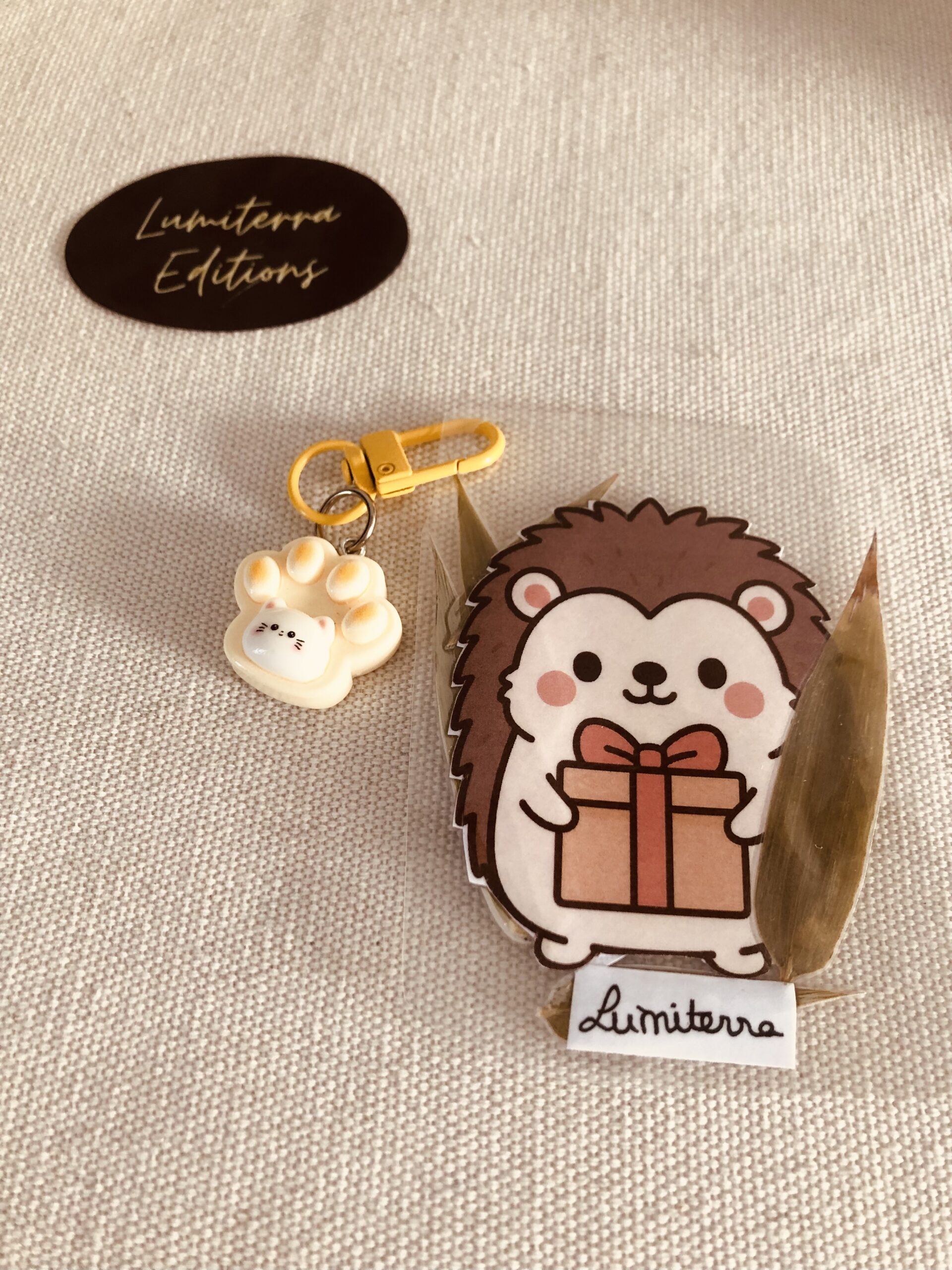Chaque pièce renferme de véritables feuilles séchées délicatement mises en valeur avec un hérisson porteur d’un cadeau. Le tout est sublimé par un charm patte de chat jaune.