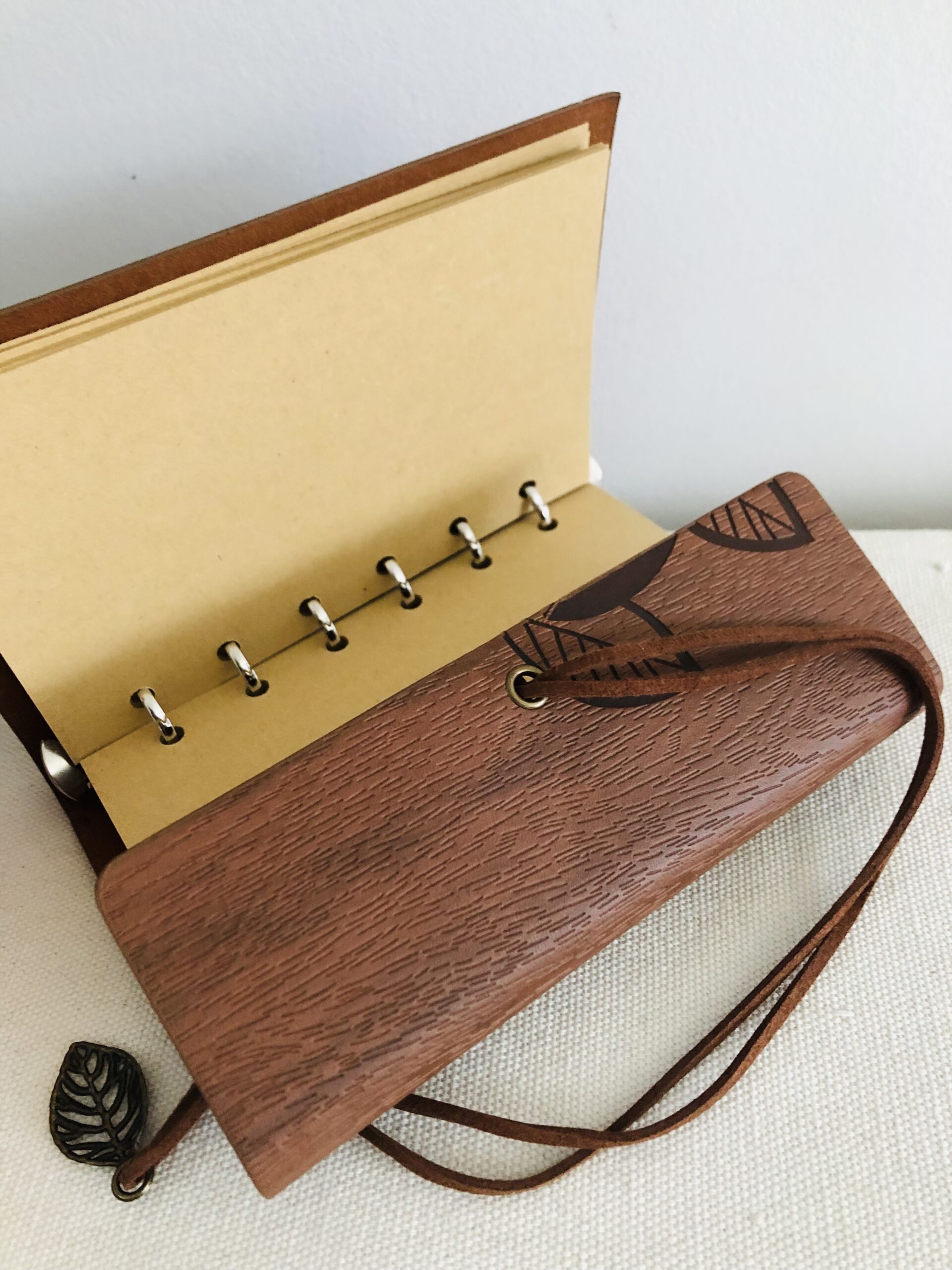 Le lien, accompagnĂ© dâun pendentif feuille mĂ©tallique, ajoute une touche artisanale et poĂ©tique.