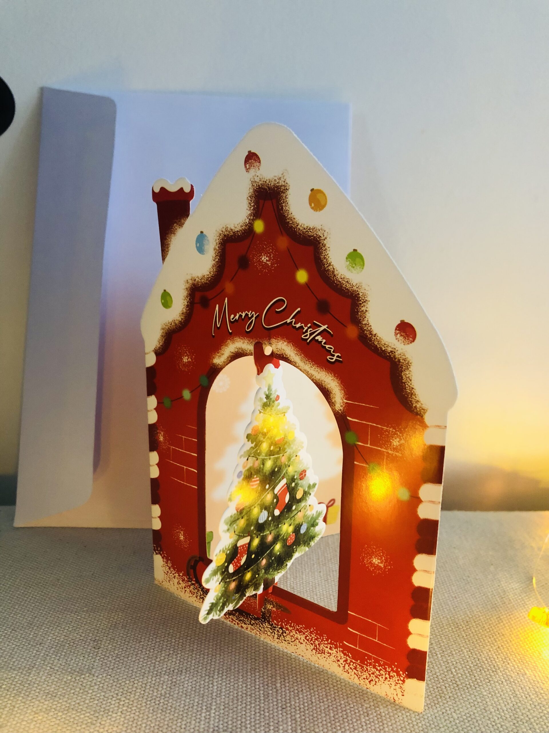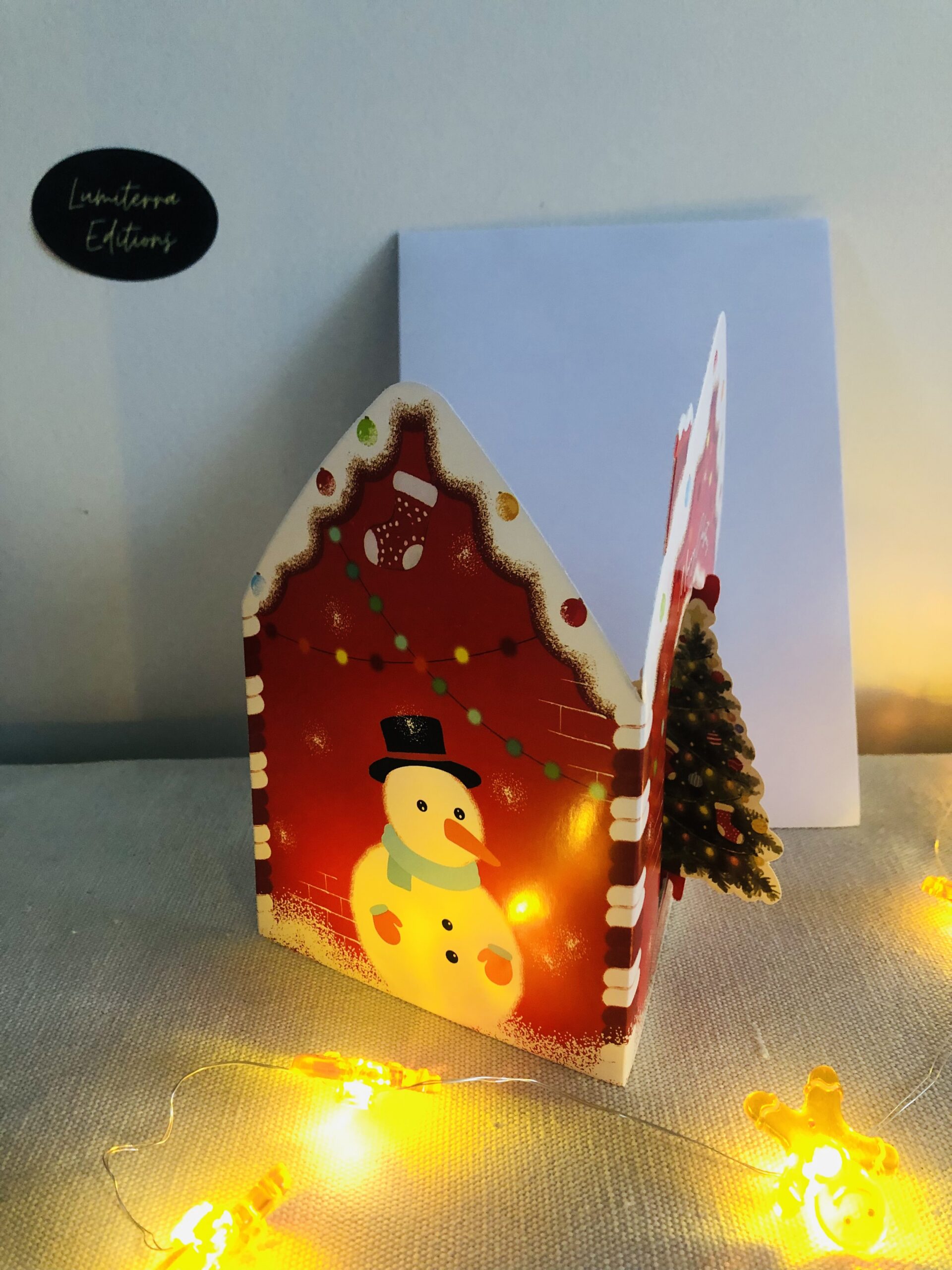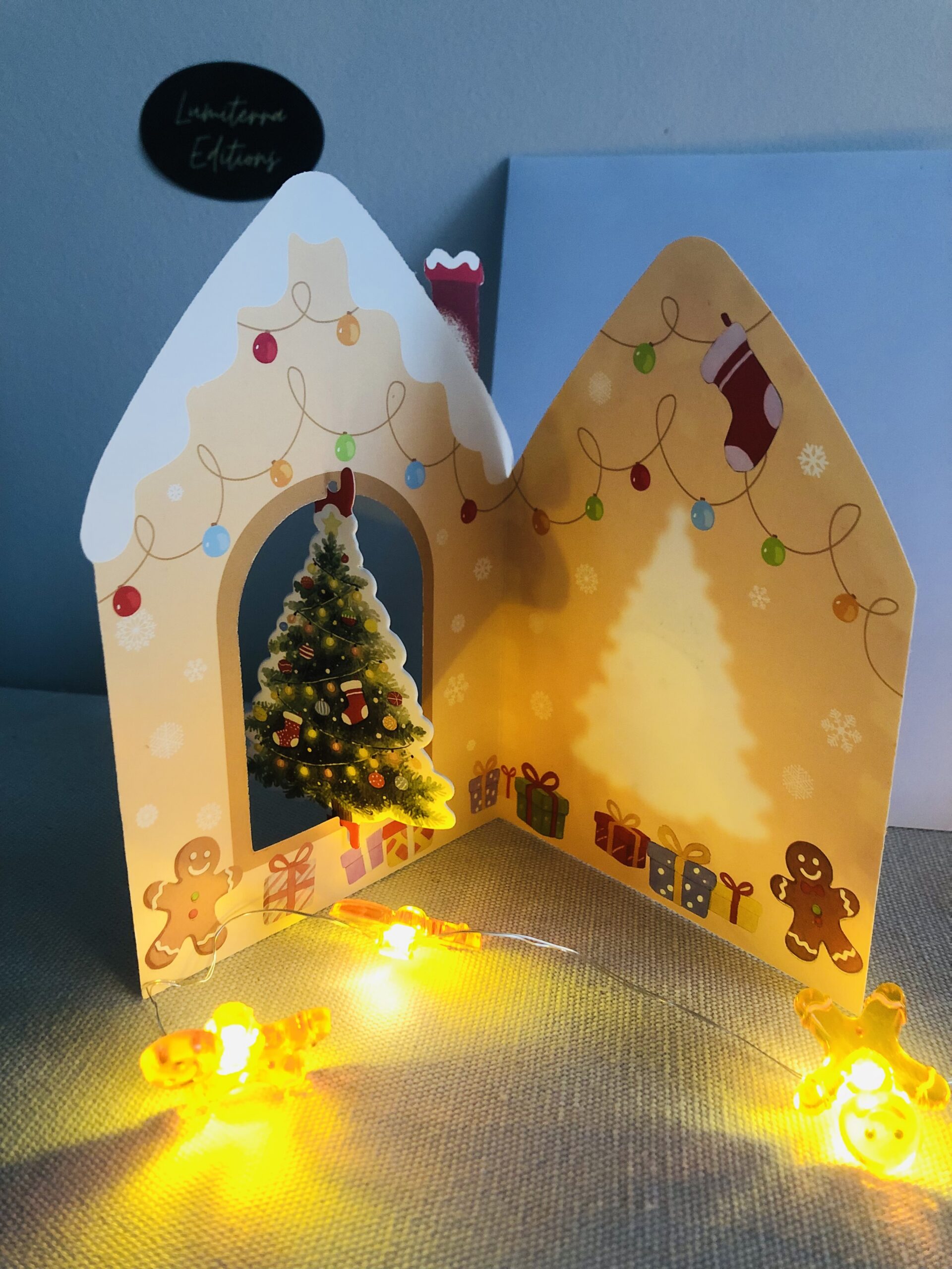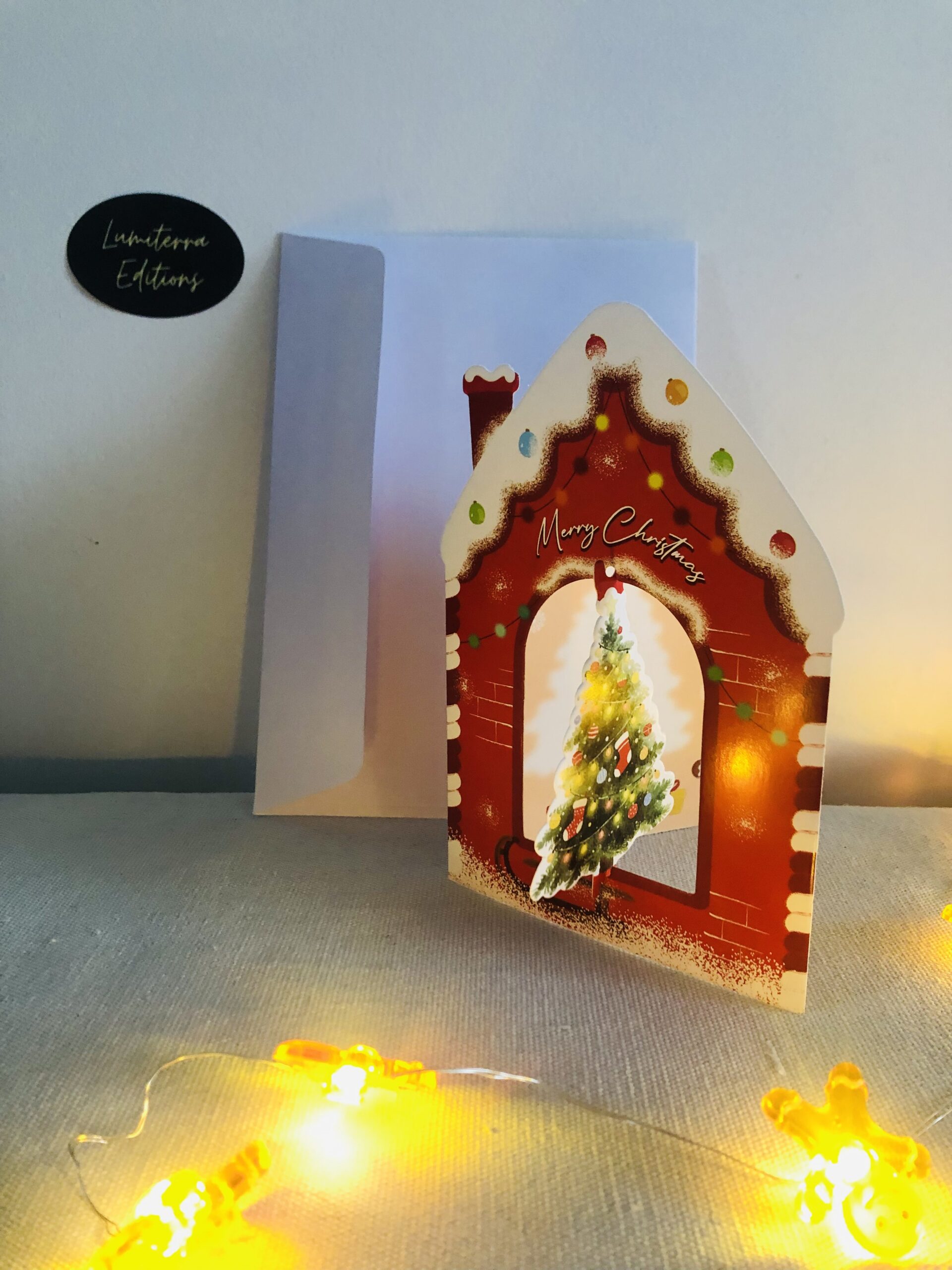 Une carte de Noël adorable et festive, parfaite pour faire fondre les cœurs. Sa forme de petite maison pain d’épices, décorée de détails colorés et d’un sapin illuminé, crée un effet chaleureux et réconfortant. Un visuel qui évoque immédiatement la magie des fêtes, les biscuits sortant du four et les lumières scintillantes.