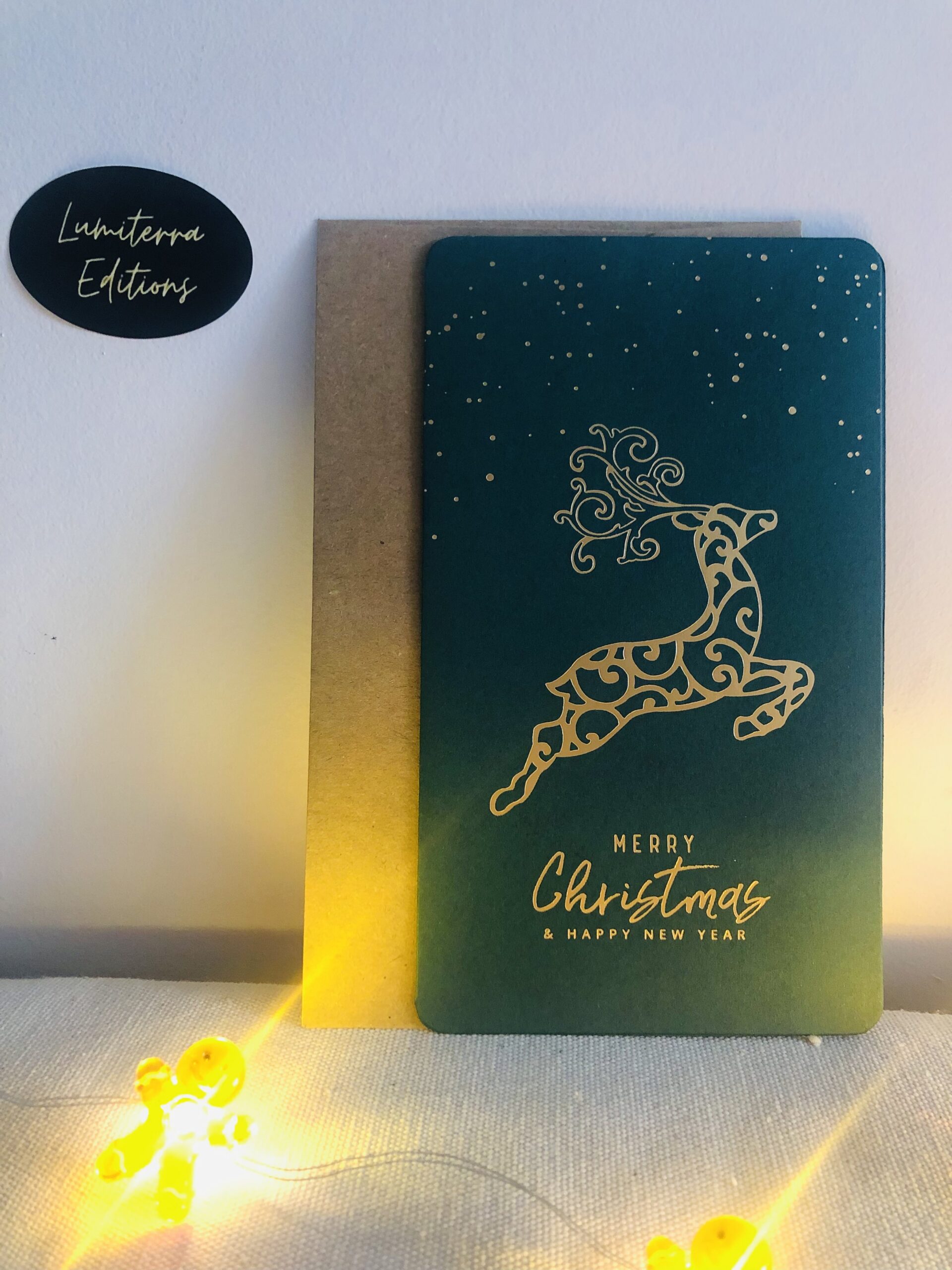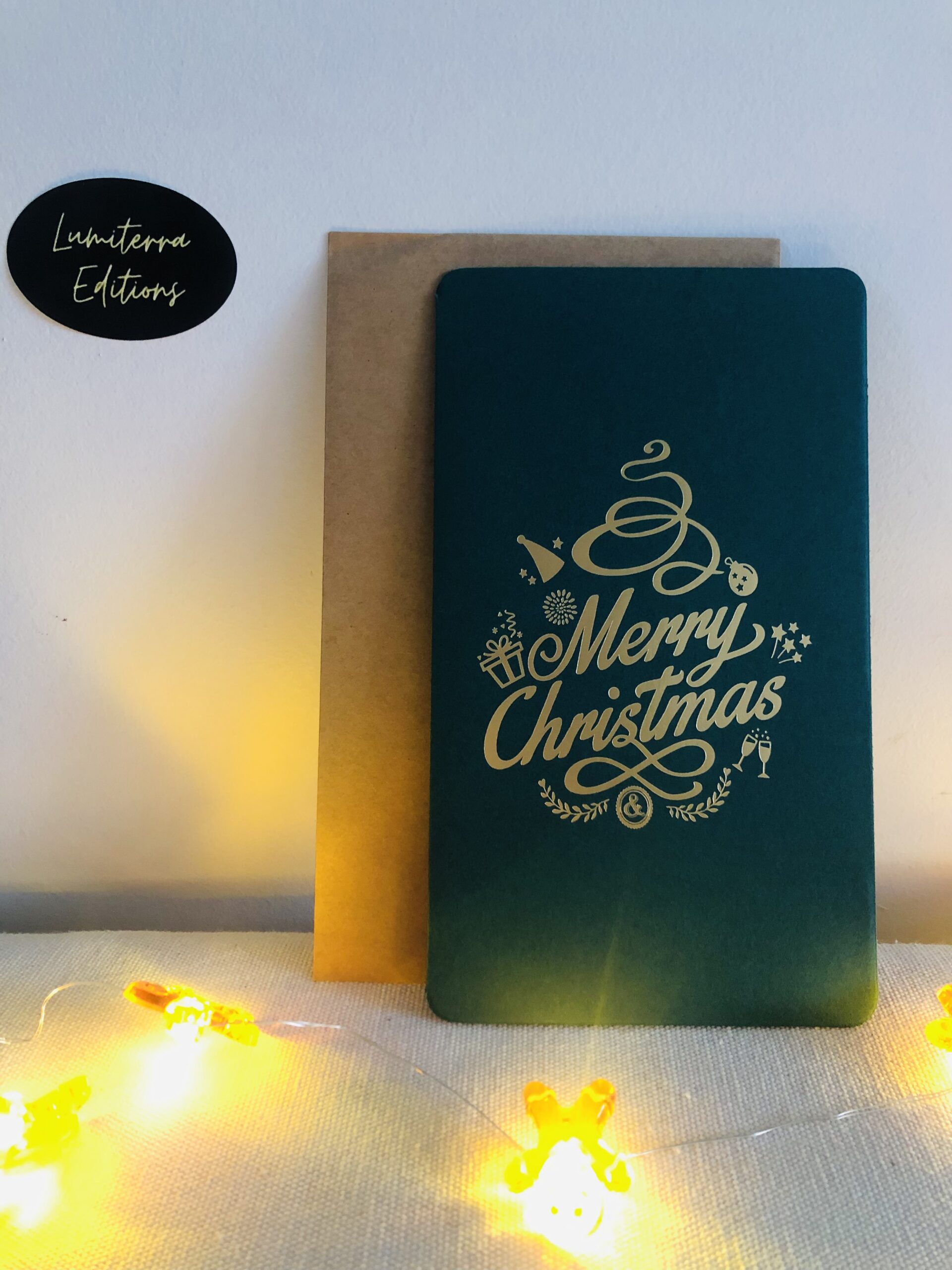 Une carte élégante et moderne qui capture toute la magie des fêtes. Son fond vert profond, rehaussé de motifs dorés formant un sapin stylisé, en fait un support raffiné pour transmettre vos vœux. Parfaite pour accompagner un cadeau et envoyer un message chaleureux.